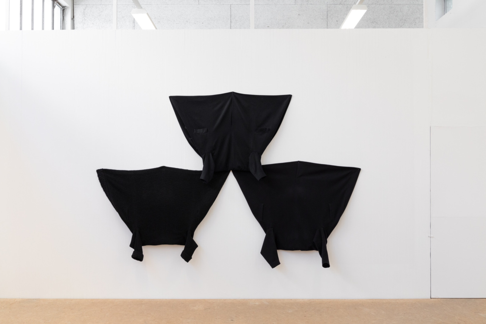«Logo» verbindet drei an die Wand gespannte schwarze Mäntel zu einem einzigen, archaisch anmutenden Zeichen. Die drei edlen Mäntel sind aus feinsten Wollstoffen gefertigt. Die Spannung liegt in der, erst bei näherer Betrachtung möglichen, Dechiffrierung der Komponenten und in der Unterscheidung der Wollqualitäten und Webarten der Stoffe. Die Bedeutung der Form des Zeichens bleibt offen, die Interpretation lässt Spielraum.