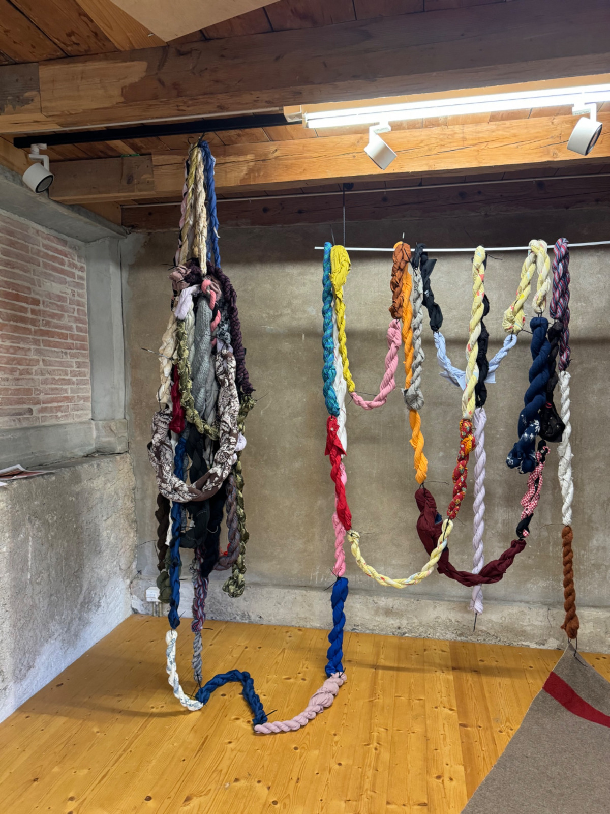 Besucher:innen bringen ausgediente Kleider in die Remise des Forum Schlossplatz. Die Kleider werden zusammen mit Sadhyo Niederberger jeweils mittwochs zu Kordeln verarbeitet. Die feinen Kordeln werden zu Bilddecken, die dicken Kordeln zu einer Arbeit im Raum komponiert. Die abgegebenen Kleider werden gekennzeichnet, zu jeder Kordel wird eine Karteikarte angefertigt.